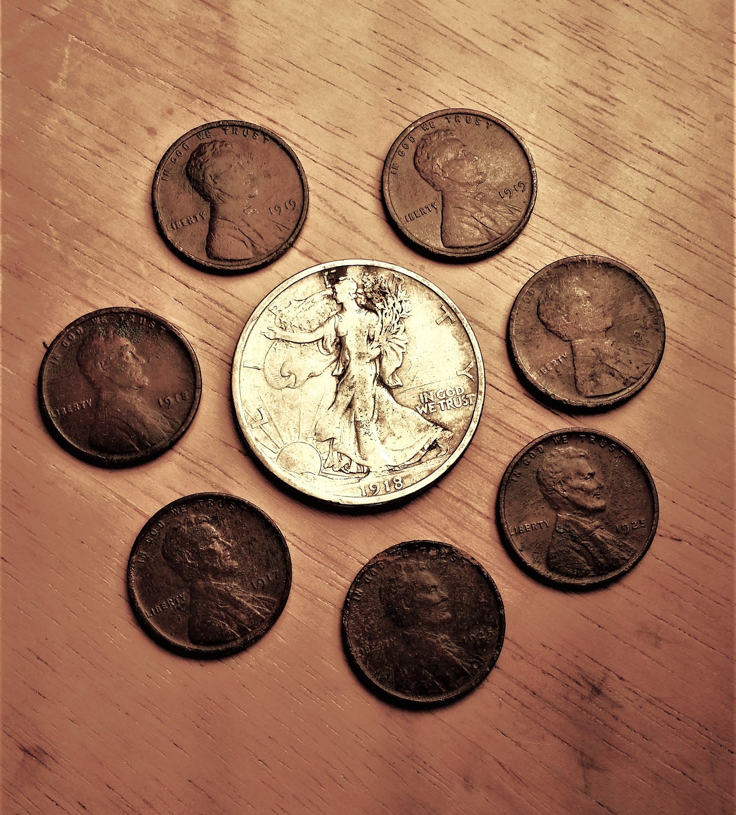 The first old coin spill that I found was on August 28, 2017, and consisted of seven wheat pennies and a Walking Liberty half dollar. This Walking Liberty half dollar was minted in 1918, but the newest penny is a 1925, so this one was at least seven years old when it was lost. The pennies came out in really good condition, which is largely determined by soil composition. Certain soils (presumably acidic, though I’ve never had them tested) really wear a coin down fast. Salt corrodes coins and can cause sand encrustation, so it really matters what kind of environment the coins were in over the years.