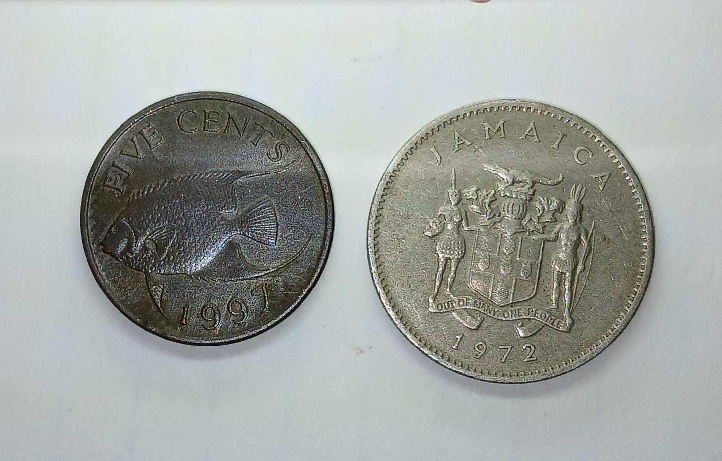 I’ve found coins from 18 countries and the European Union, including: Belgium, Bermuda, Chile, China, Dominican Republic, Germany, Great Britain, Honduras, Hong Kong, Jamaica, Japan, Mexico, Panama, Poland, Sierra Leone, Spain, Taiwan, and Venezuela. Below are photos of a few of the better ones. Not all of my finds are in good enough condition to get decent photos, so not all are shown below.