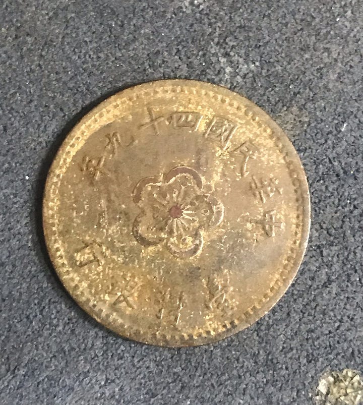 I asked ChatGPT about the coin from Taiwan. Here is what he had to say: "it’s a Republic of China (Taiwan) 1 Yuan coin, issued after 1949 following the ROC government’s move to Taiwan. These were typically struck in brass and circulated widely during the 1960s–1970s. The plum blossom is the ROC national flower, and the reverse botanical imagery reflects themes of agriculture and prosperity common in postwar Taiwanese coinage."