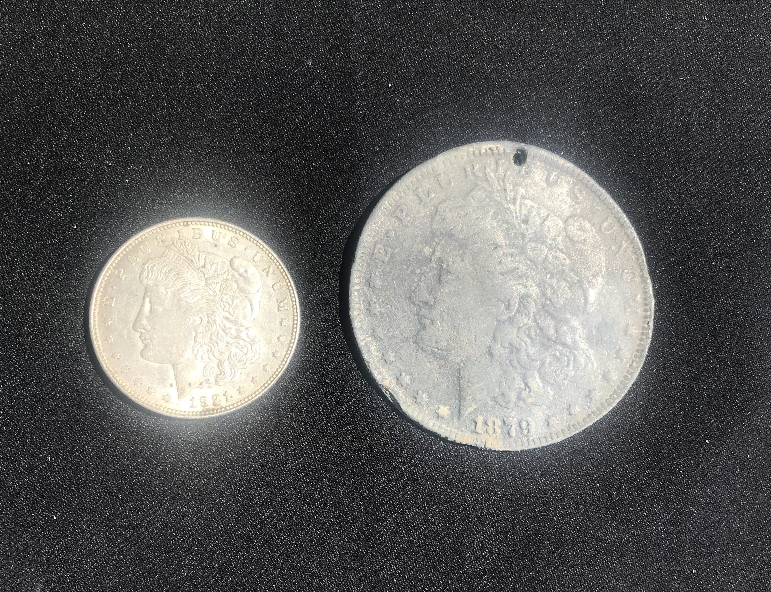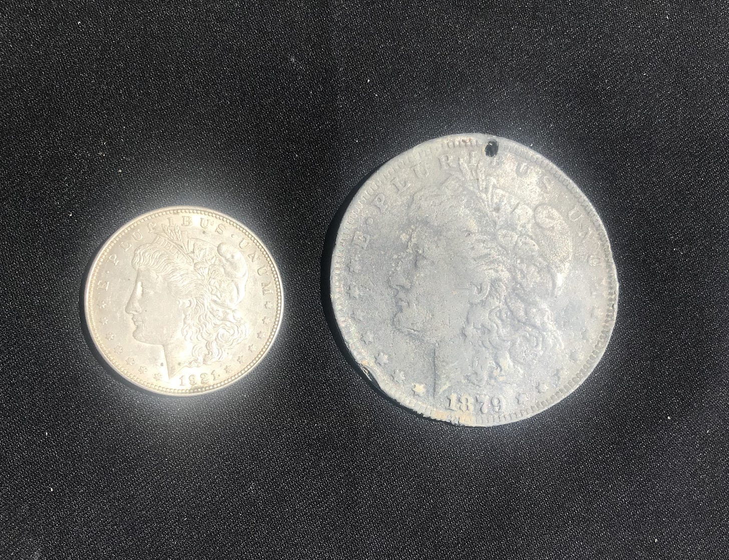 And finally, a replica of an 1879 silver dollar. I found this creek detecting last year, and you can imagine my excitement when it first came out of the water. But I soon realized it was too large to be real, and not made of silver. It does have a hole through it—was someone wearing it as a necklace?