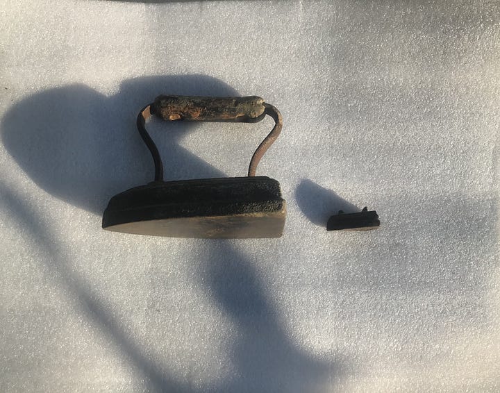 Next is this brass (I believe) plow. What was it used for? A wall decoration, perhaps? But there are no screw or nail holes to suggest it was mounted, nor any evidence it broke off a larger piece. Again, could it have been a child’s toy? I find that hard to imagine, but I really don’t know.