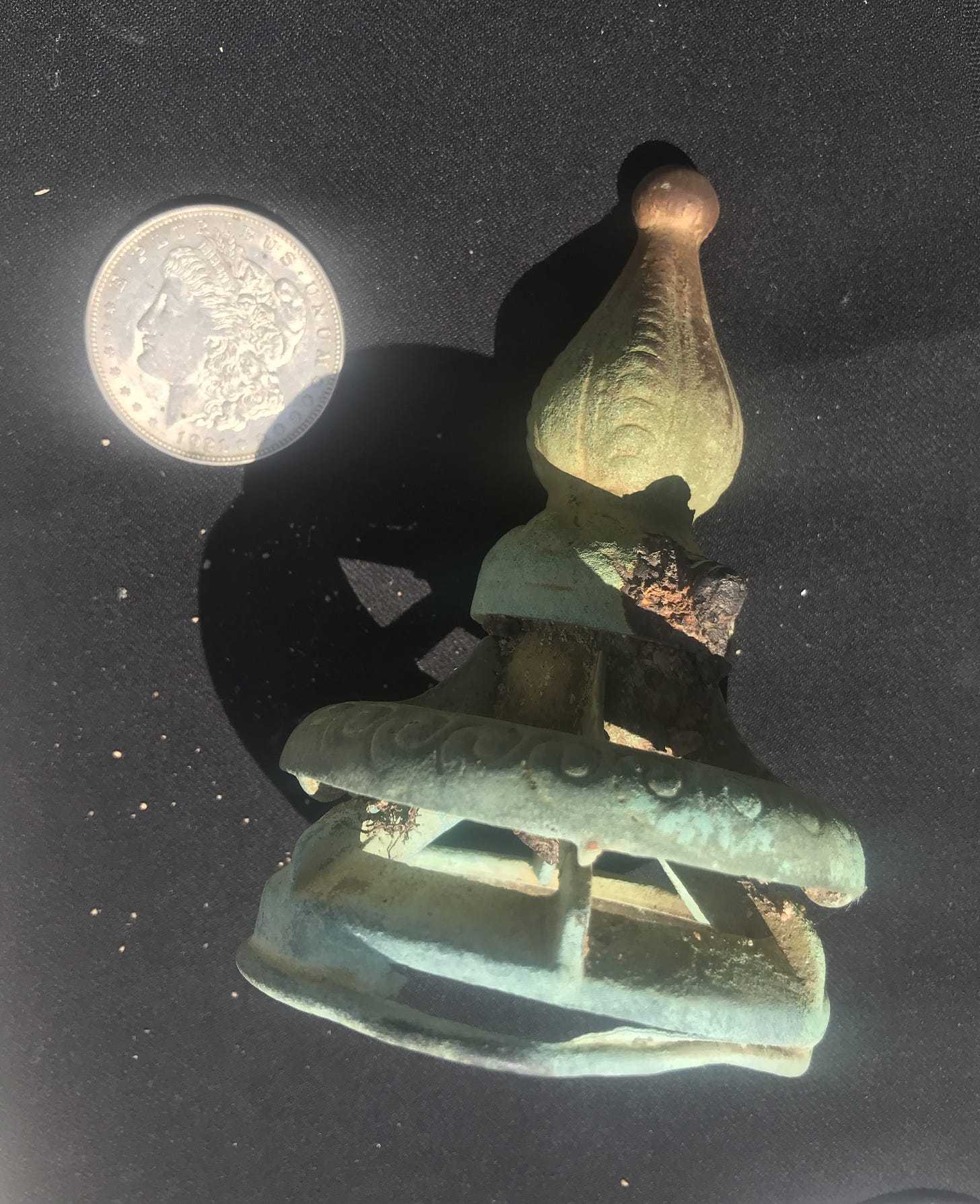 Next up is a brass piece I pulled from a creek recently. It’s fairly heavy and has some interesting designs on it. Could it be from a cupola or pergola? Part of a brass bed? I doubt that, but I’m stumped.